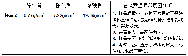 直接將樣品放入水中,由于較多的氣泡和較大的表面張力,樣品浮于水面,明顯與“金”的密度不符。經(jīng)過一定的除氣操作,樣品沉入水底。由于氣泡多,數(shù)據(jù)測試不準(zhǔn)。僅以樣品2的密度測試數(shù)據(jù)為例進(jìn)行說明。